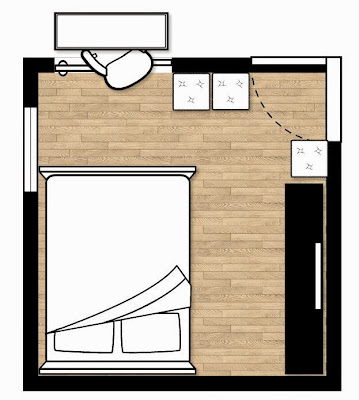 -Dark Gray walls-More clothing storage, with traditional sized drawers, without sacrificing floor space and his queen sized bed.