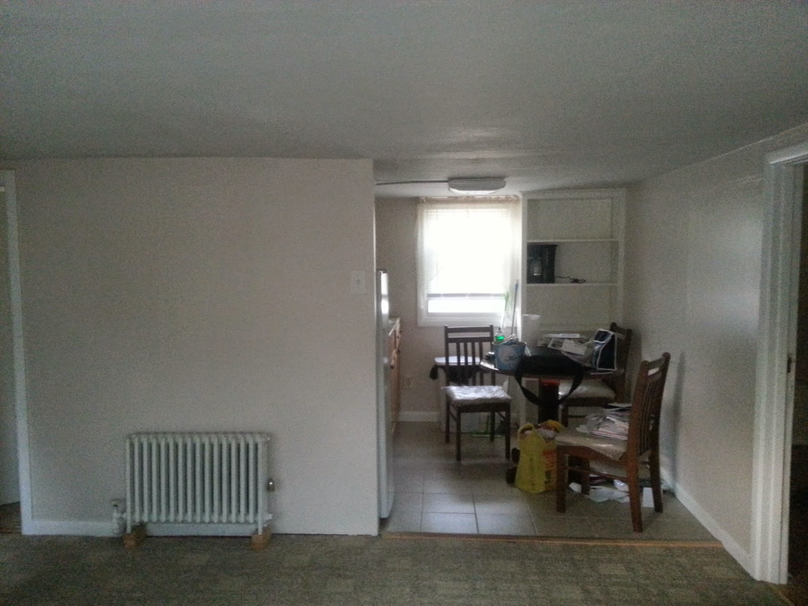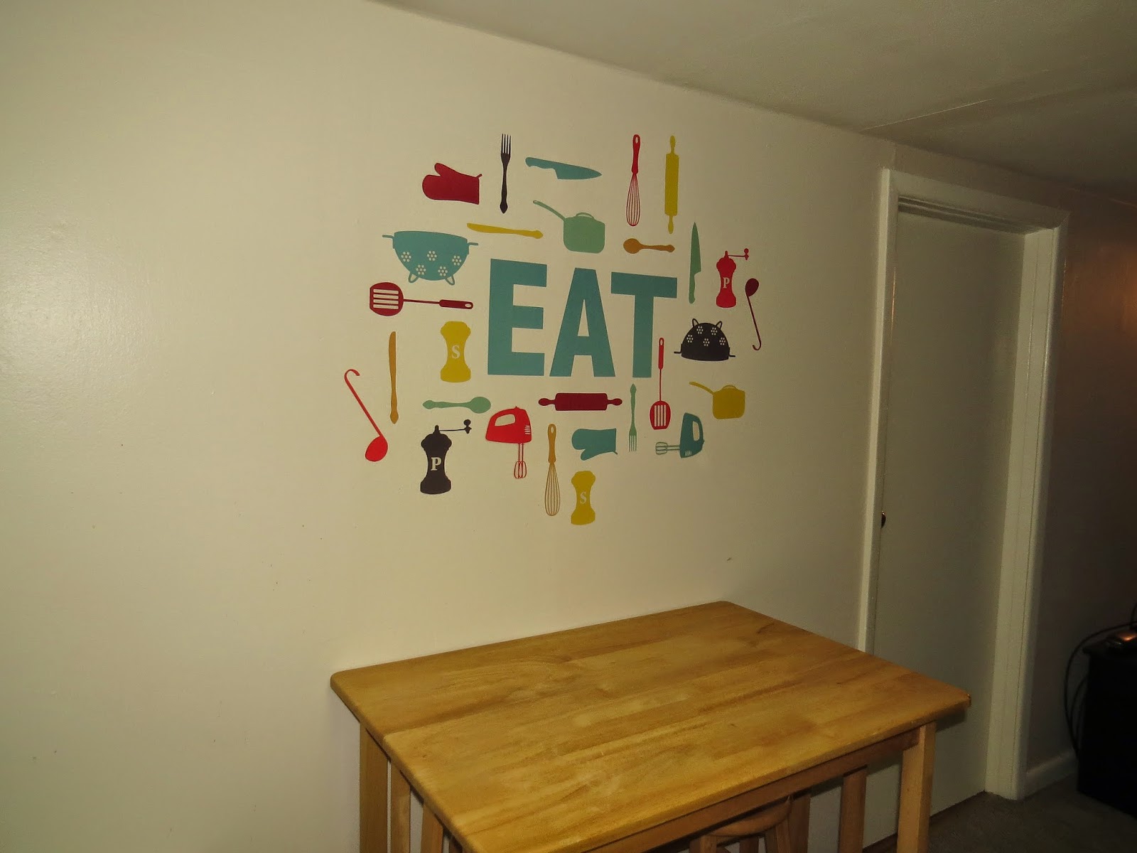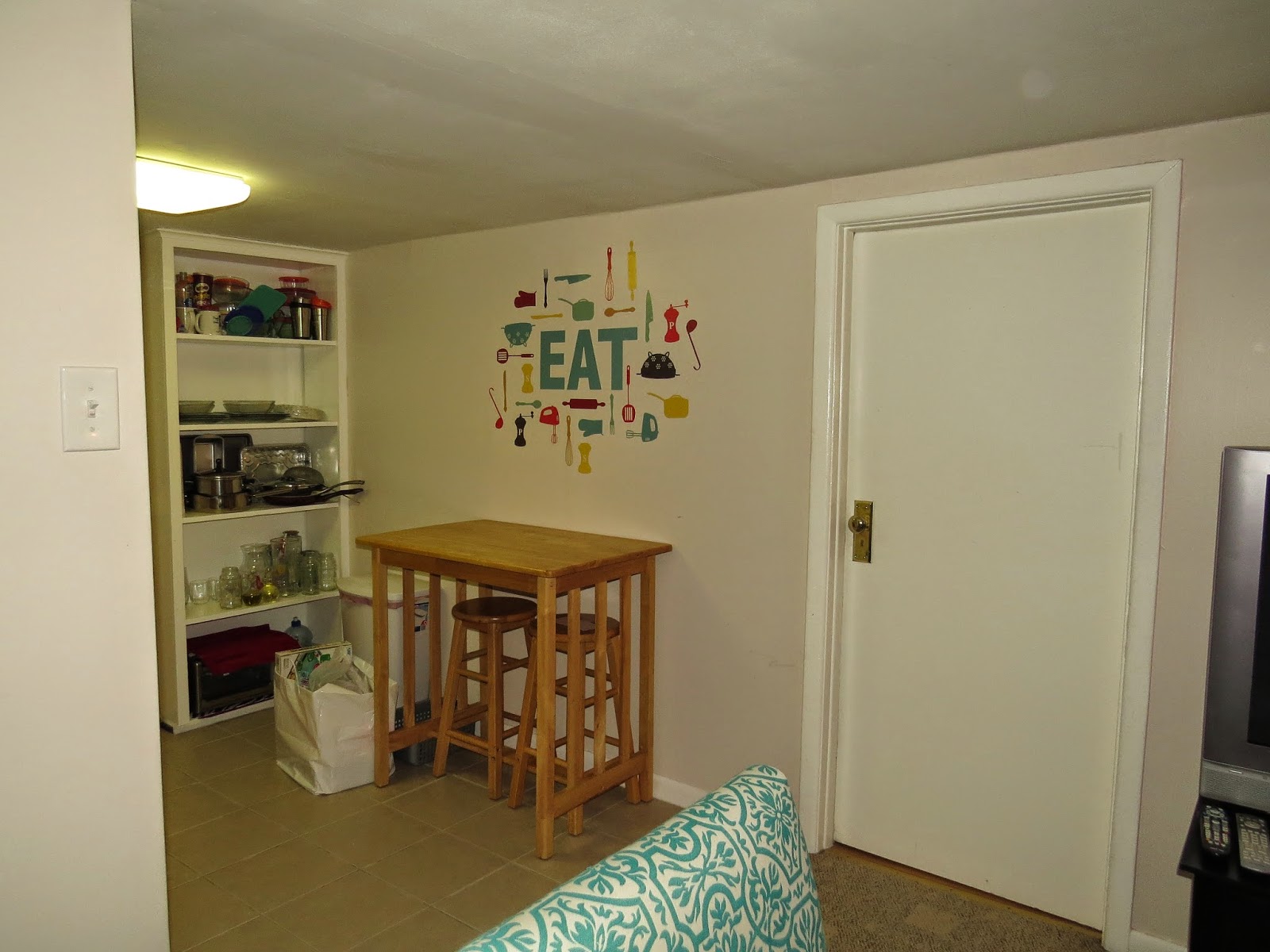 The Blue Room (12x 13 ½) is intended as a formal dining room, but we are a young family so it suits us better to use it as our computer room /office/ dining room/ music room/ art studio /game room......Family Room. The current Blue Room configuration is very open, with the computer desk, printer stand, drumset, a few shelving units and a bar height table with 4 stools. The TV was mounted right above the table which is way too close for the kids to sit and eat in front of and the table was too small for us all to eat together. We'd have to pull the table away from the wall whenever any of us ate while watching TV or if there were more than 2 of us sitting together for a meal, which was at least once a day. Other than that the room's current set up functioned best to our needs.