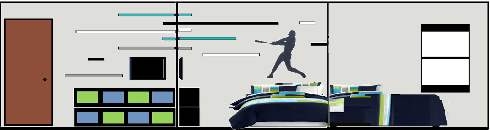 In the Blue room I wanted a dining area (that we didn't have to constantly be pulling out whenever we wanted to sit together or if we wanted to watch TV while eating a meal) without losing the other functions we needed. I decided the best way to execute that is switch the walls the TV and large canvas print were on, and purchase a larger table top for the bar table base I already had. I also got 6 new stools for additional dining seating. I got rid of the printer stand and rearranged the rest of the shelving units I already had and installed a new ceiling fan, since I took the one out of the living room. The ceiling fan light was not as bright as we sometimes need so I also purchased a floor lamp, which I placed on top of the "Art Supplies" shelving unit with a dimmer switch, for whenever we needed bright lighting. I wanted to add funky colorful twist on the wall surrounding the TV, so I ordered the Safari and North American Sets on Cardboard Safari and had the kids make their own designs on them.